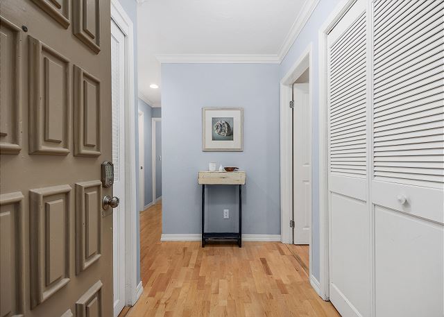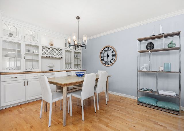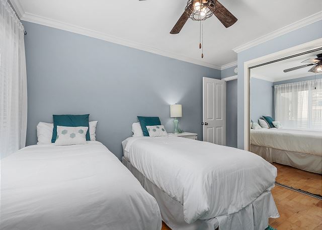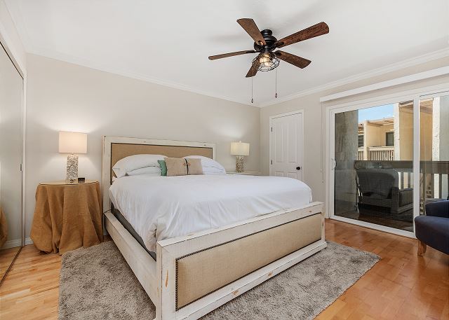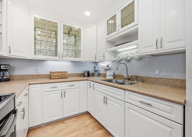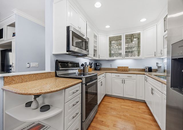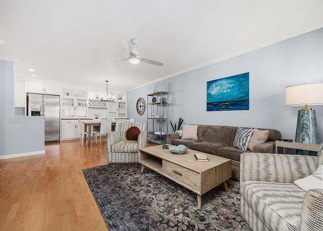 • Spacious floor plan with large kitchen, two bedrooms, and coastal-inspired decor