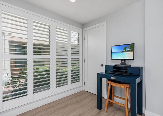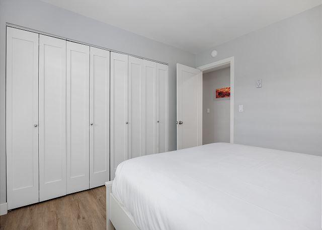 • Second bedroom with a cozy queen bed an a dedicated workspace with desk and chair, perfect for remote work or study